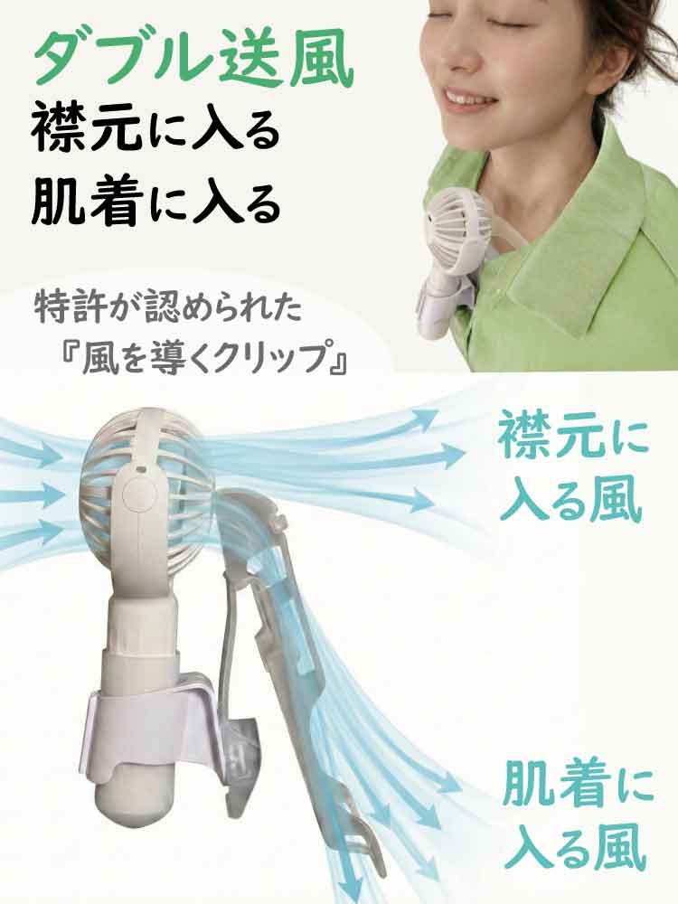 「肌着の中」と「襟元の中」の両方へ風を送り込む「ダブル送風」を実現。シャツ内を広範囲に換気し続けることで、汗の気化熱による冷却効果を最大限に引き出します。