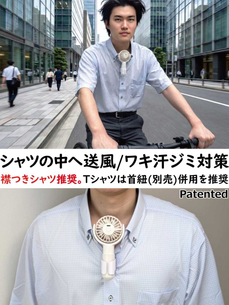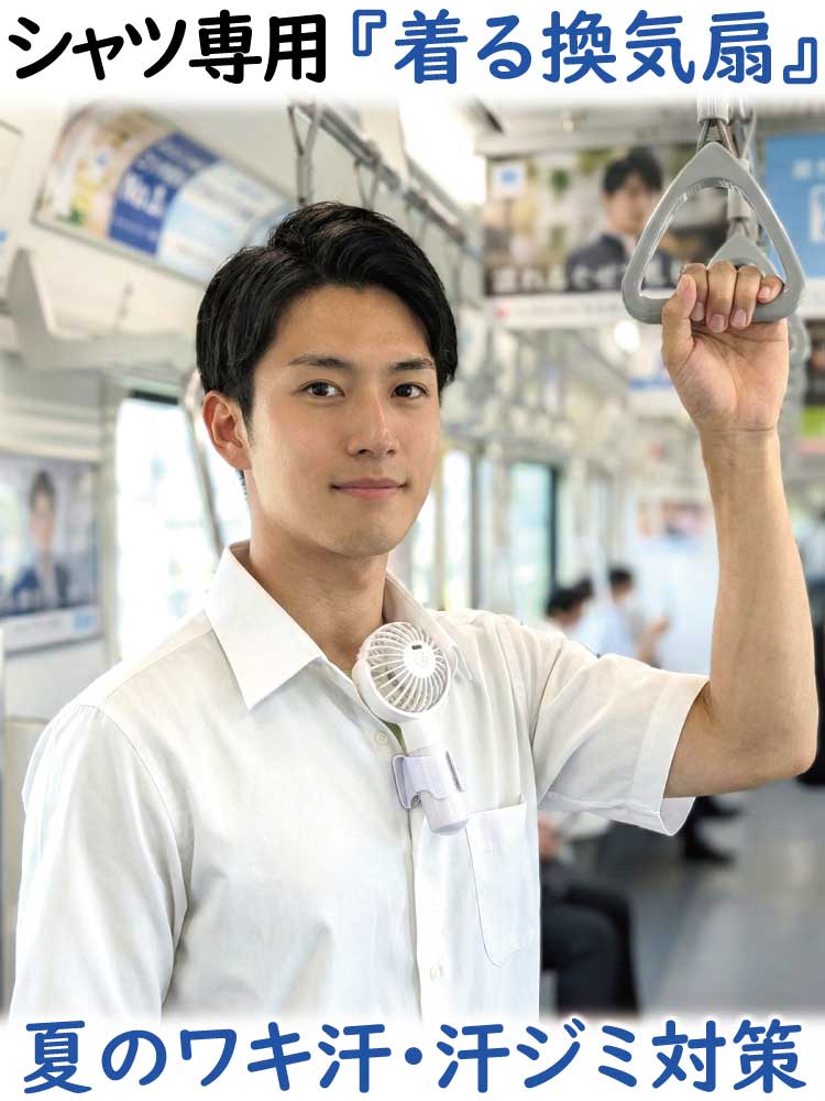シャツの汗ムレ/汗ジミ/ワキ汗/胸汗(ブラ汗)の対策ツールです。エアシャツ扇風機は下記のアマゾン公式ショップにて販売。